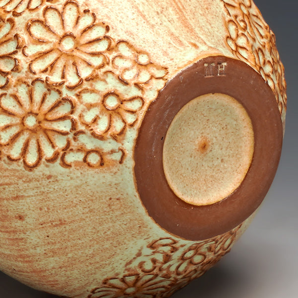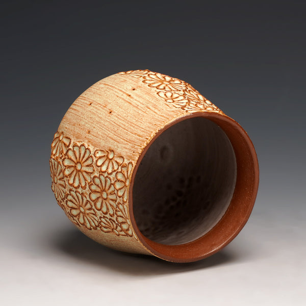cone 5 red stoneware and glaze with hand-carved floral motif