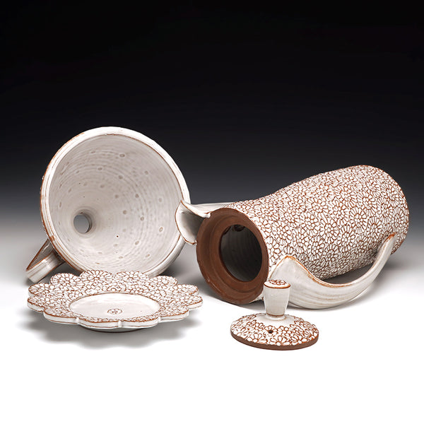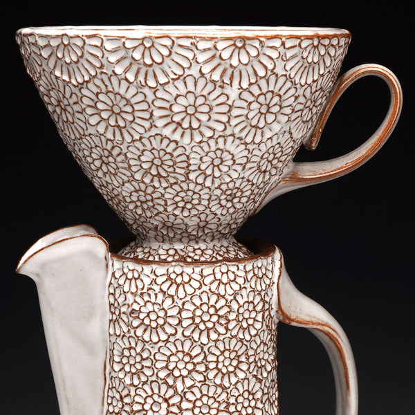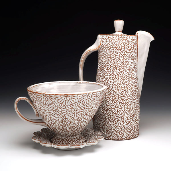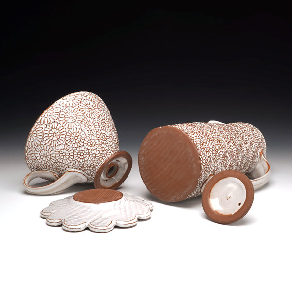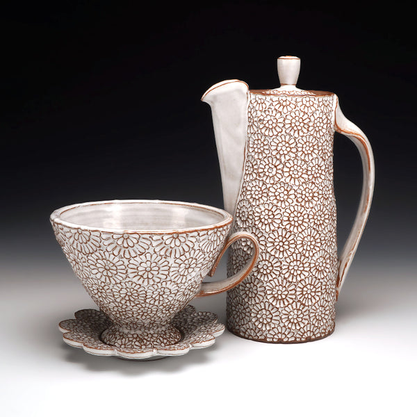cone 5 red stoneware and glaze with hand-carved floral motif